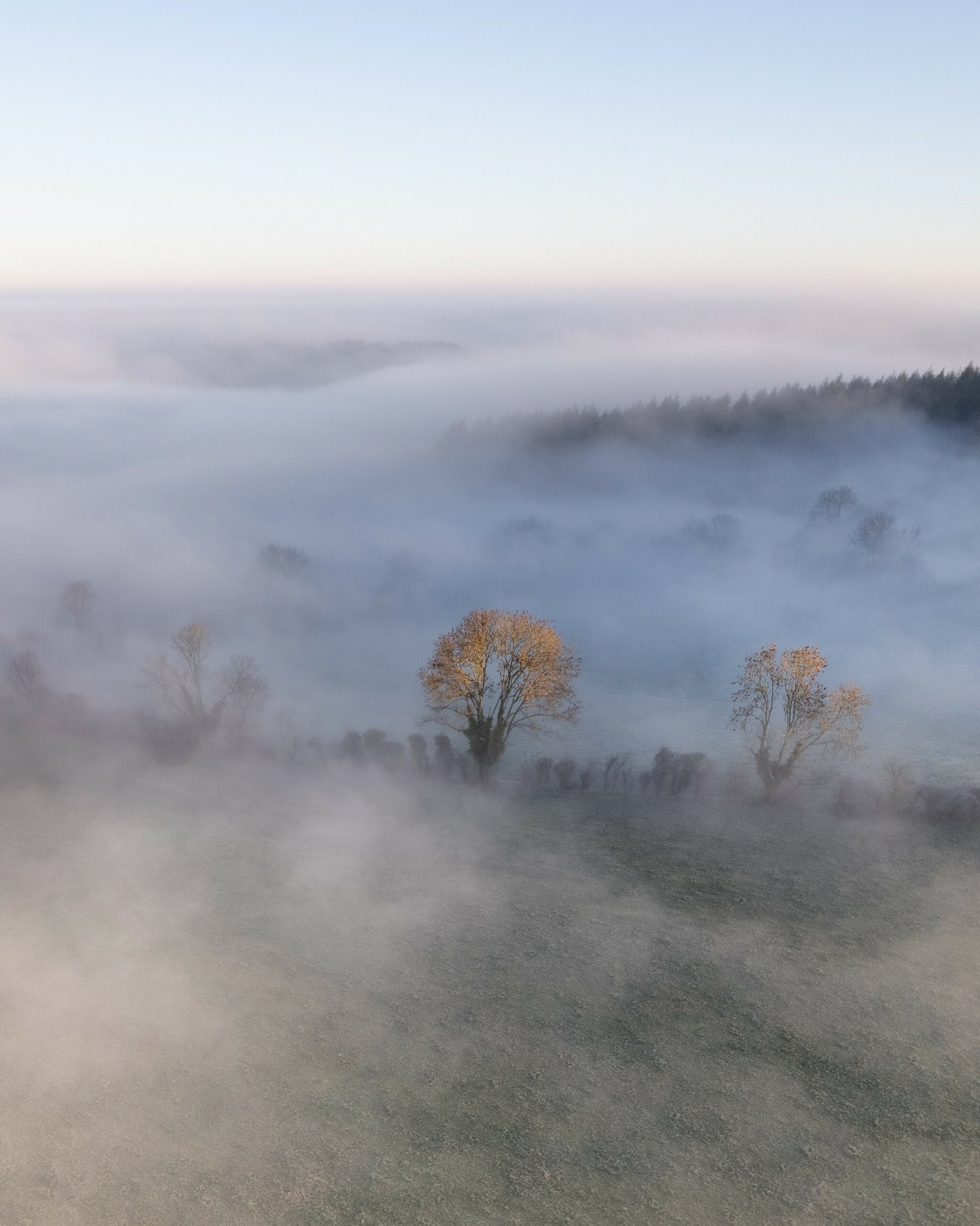 Cette série dévoile des paysages normands baignés dans la brume matinale, où collines et vallées se fondent dans une atmosphère mystérieuse et sereine.